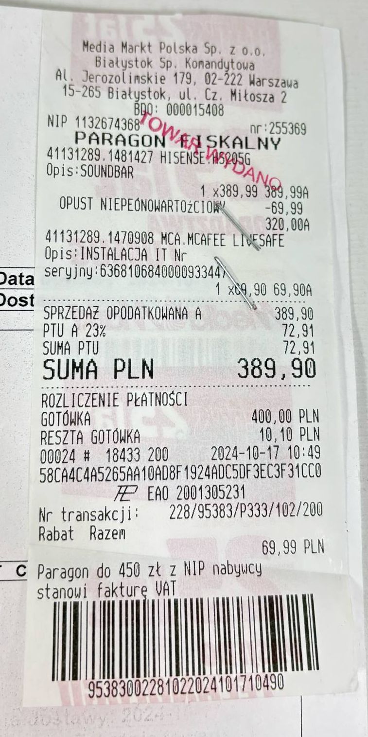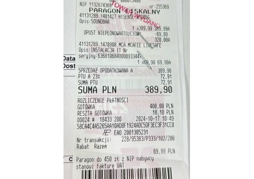 UWAGA! Do towaru dołączony jest dowód zakupu (paragon) od dnia: 2024-10-17!